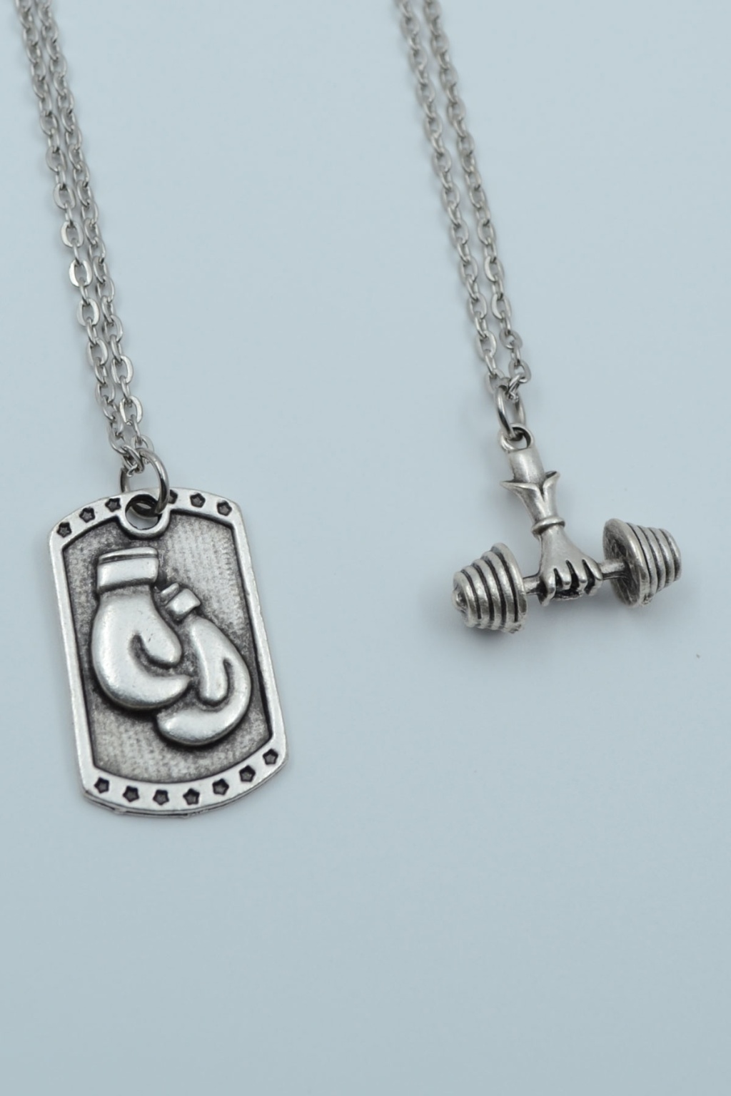 2'li Boks Eldiveni Künye Dambıl Halter Gümüş Kaplama Kolye Seti