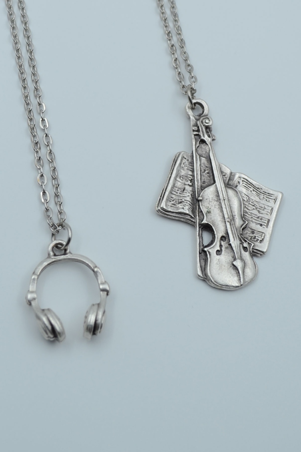 2'li Keman Nota Defteri Kulaklık Gümüş Kaplama Kolye Seti