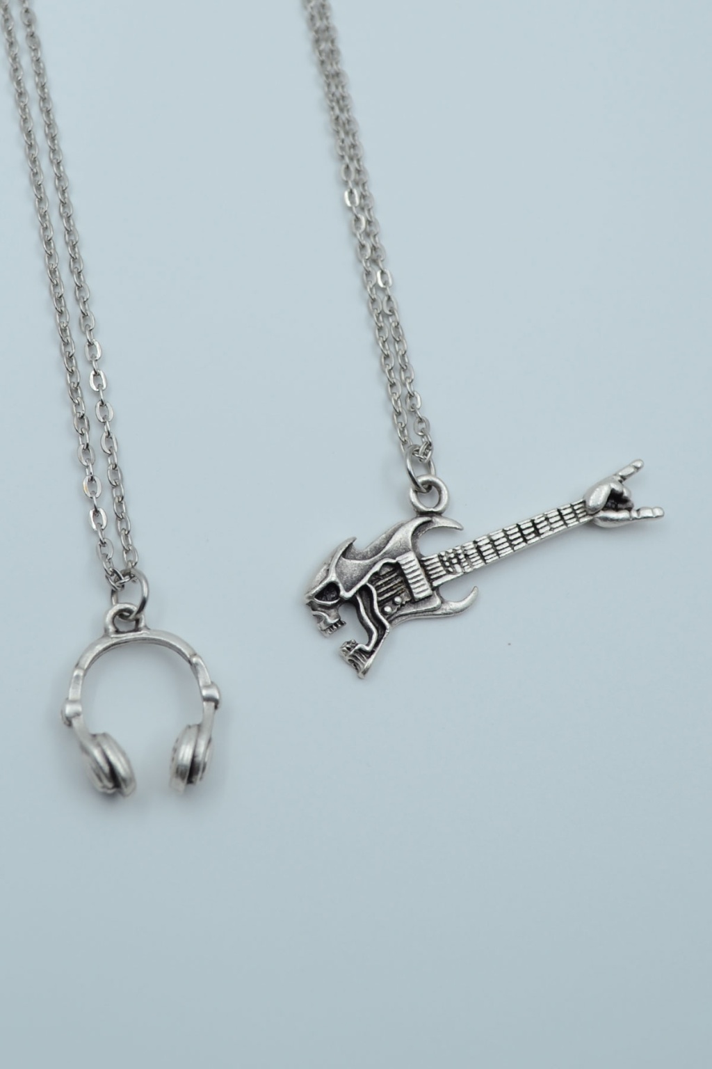 2'li Kulaklık Kuru Kafa Elektro Gitar Gümüş Kaplama Kolye Seti