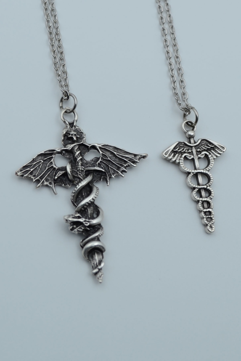 2'li Yarasa Yılan Kılıç Tıp Kadüse Gümüş Kaplama Kolye Seti