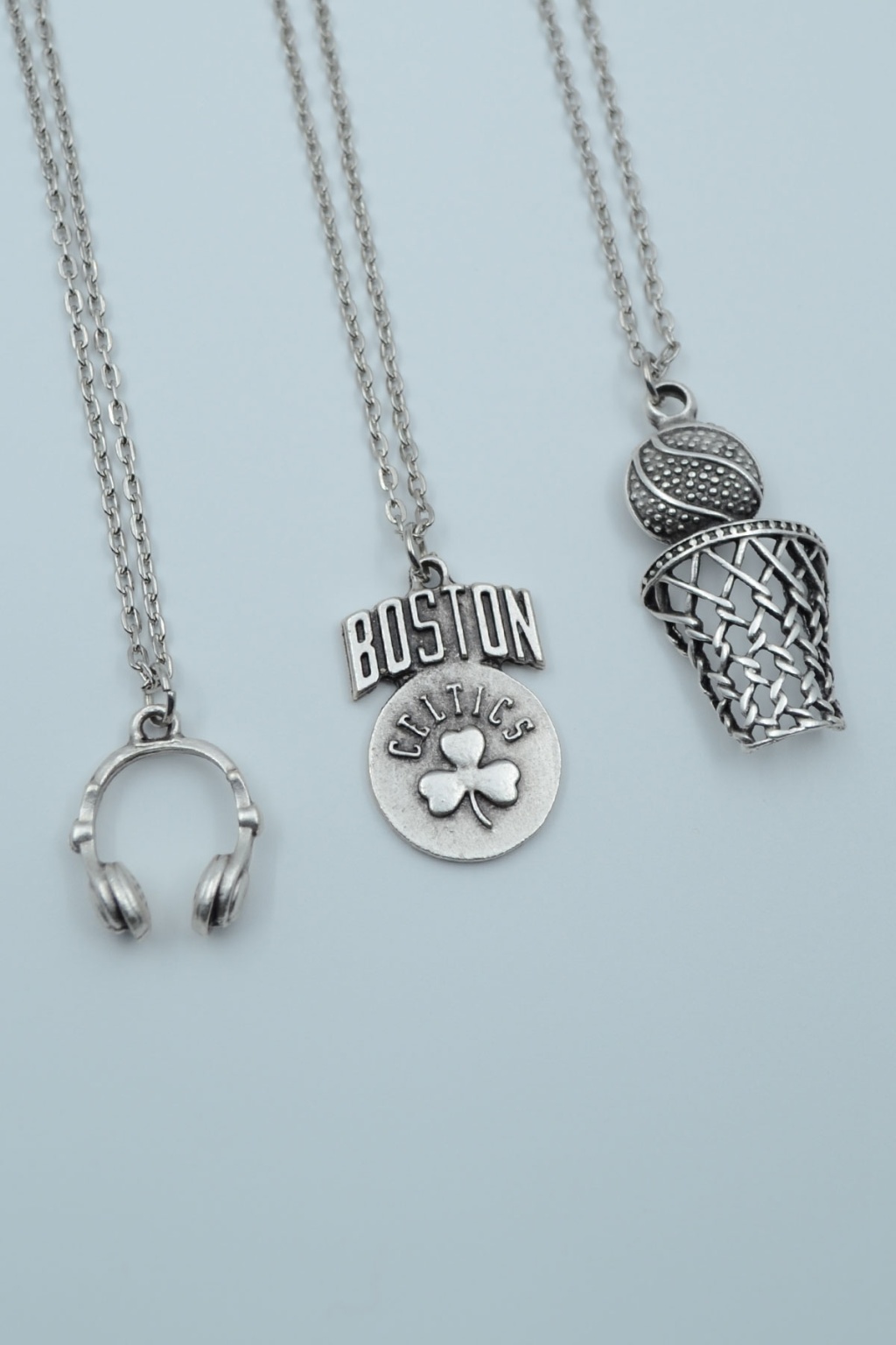 3'lü Kulaklık Basket Topu File Pota Boston Celtics Gümüş Kaplama Kolye Seti
