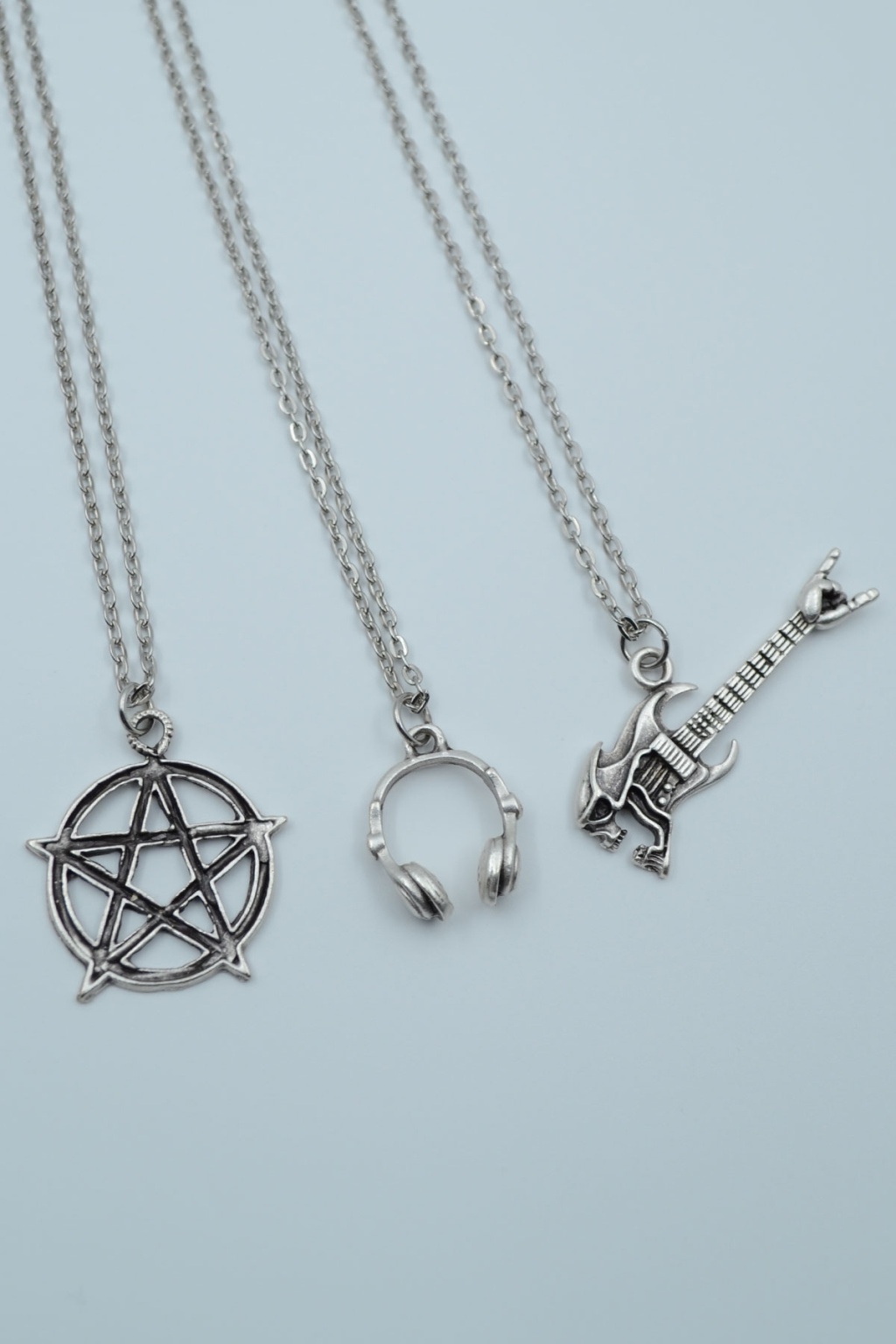 3'lü Pentagram Kuru Kafa Gitar Kulaklık Gümüş Kaplama Kolye Seti