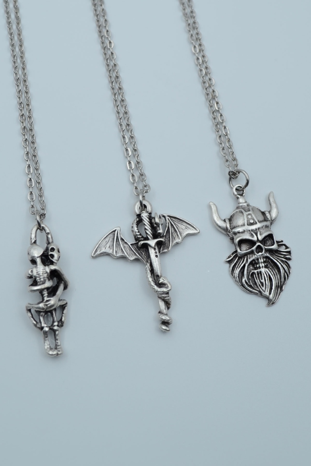 3'lü Sarılan İskelet Ejderha Kılıç Viking Savaşçı Gümüş Kaplama Kolye Seti