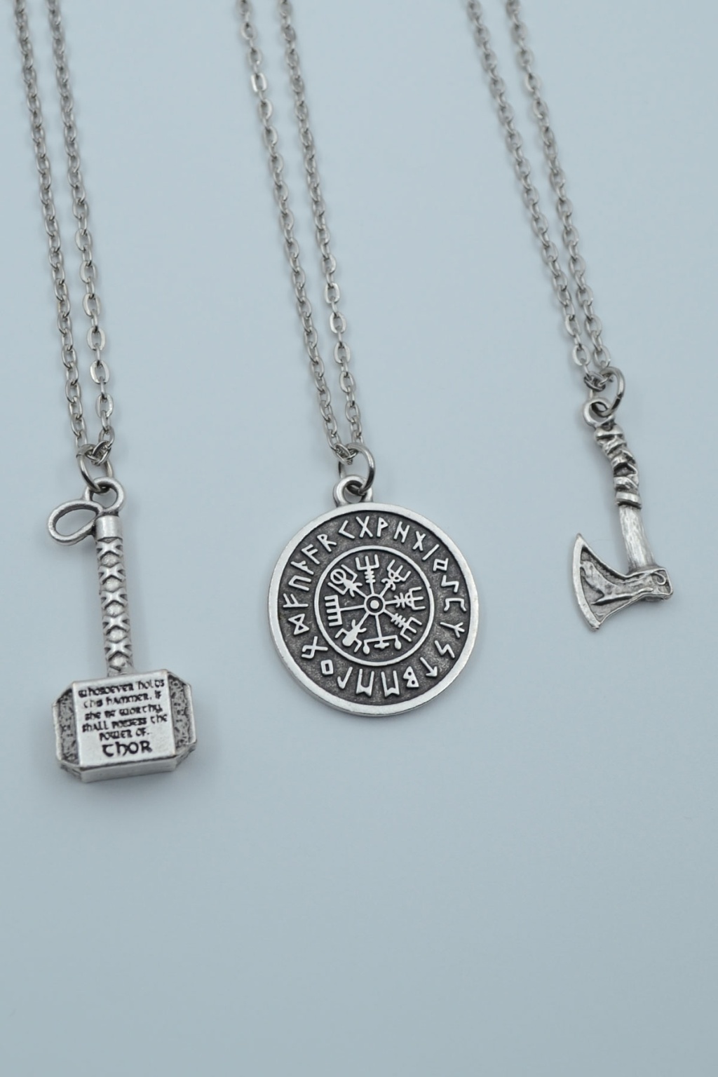 3'lü Thor Çekiç Viking Balta Viking Pusula Gümüş Kaplama Kolye Seti