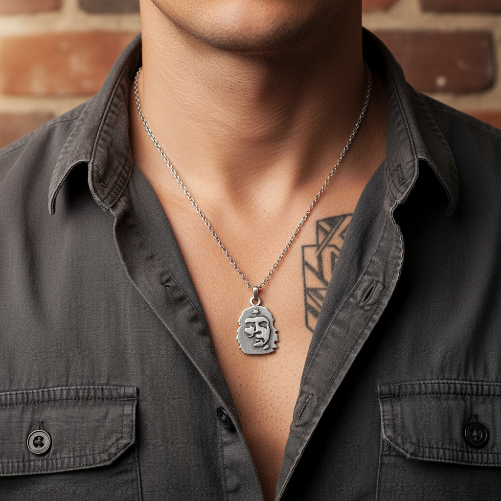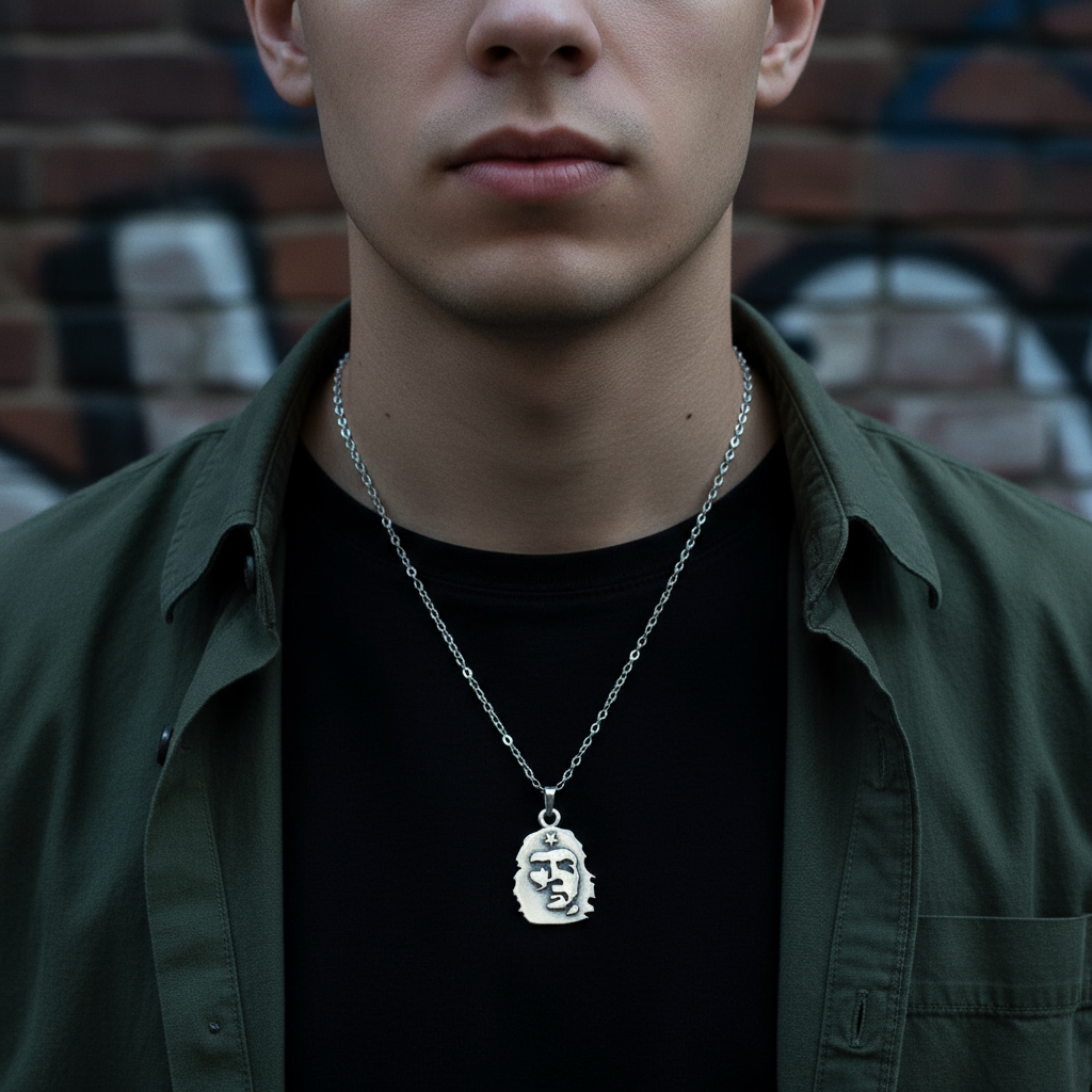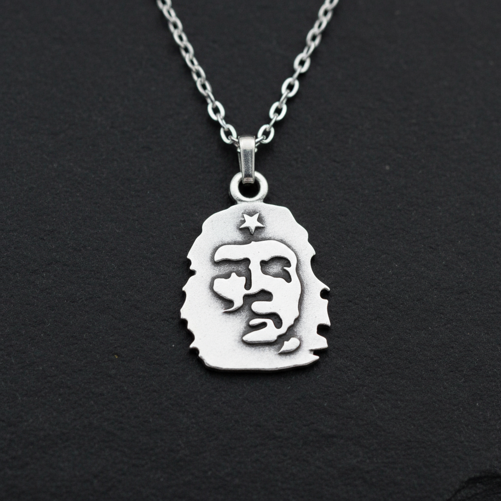Devrimin, özgürlüğün ve direnişin simgesi: Che Guevara Kolyesi. Tarihin en ikonik figürlerinden biri olan Che Guevara, bu özel tasarım kolyede asil bir siluetle hayat buluyor. Antik gümüş kaplama yüzeyi, zamansız bir duruş ve cesur bir karakter sergiliyor. Zamak malzemeden üretilen bu anlamlı tasarım; 3,7 x 2,6 cm boyutları ve 4,64 gram ağırlığıyla koleksiyonlara değer katan özel bir parçadır. 60 cm uzunluğundaki ithal düz ezme zinciri, sade ama güçlü bir görünümü tamamlar. Unisex yapısıyla hem kadınlar hem de erkekler için ideal bir aksesuar olan bu kolye, özgürlüğe, bağımsızlığa ve asi bir ruha inananların tarzına karakterli bir dokunuş katıyor.