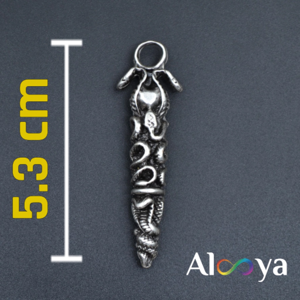 Alooya Çift Yılanlı Çubuk Kolyesi, antik mitolojilerden ilham alan büyüleyici bir tasarıma sahiptir. Zarif kıvrımlarıyla dikkat çeken yılan figürleri, bilgeliği, gücü ve dönüşümü simgeler. Antik gümüş kaplaması ile hem modern hem de klasik stillere mükemmel şekilde uyum sağlar.Zamak malzemeden üretilen kolye ucu 5,2 cm x 1,5 cm boyutlarında ve 8,39 gram ağırlığındadır. 60 cm uzunluğundaki ithal silver renk ÖRME zincir seçeneğiyle birlikte sunulur. Günlük kullanıma uygun sağlam yapısı sayesinde uzun ömürlüdür. Kadın ve erkek takı severler için unisex bir tasarım olarak öne çıkar.