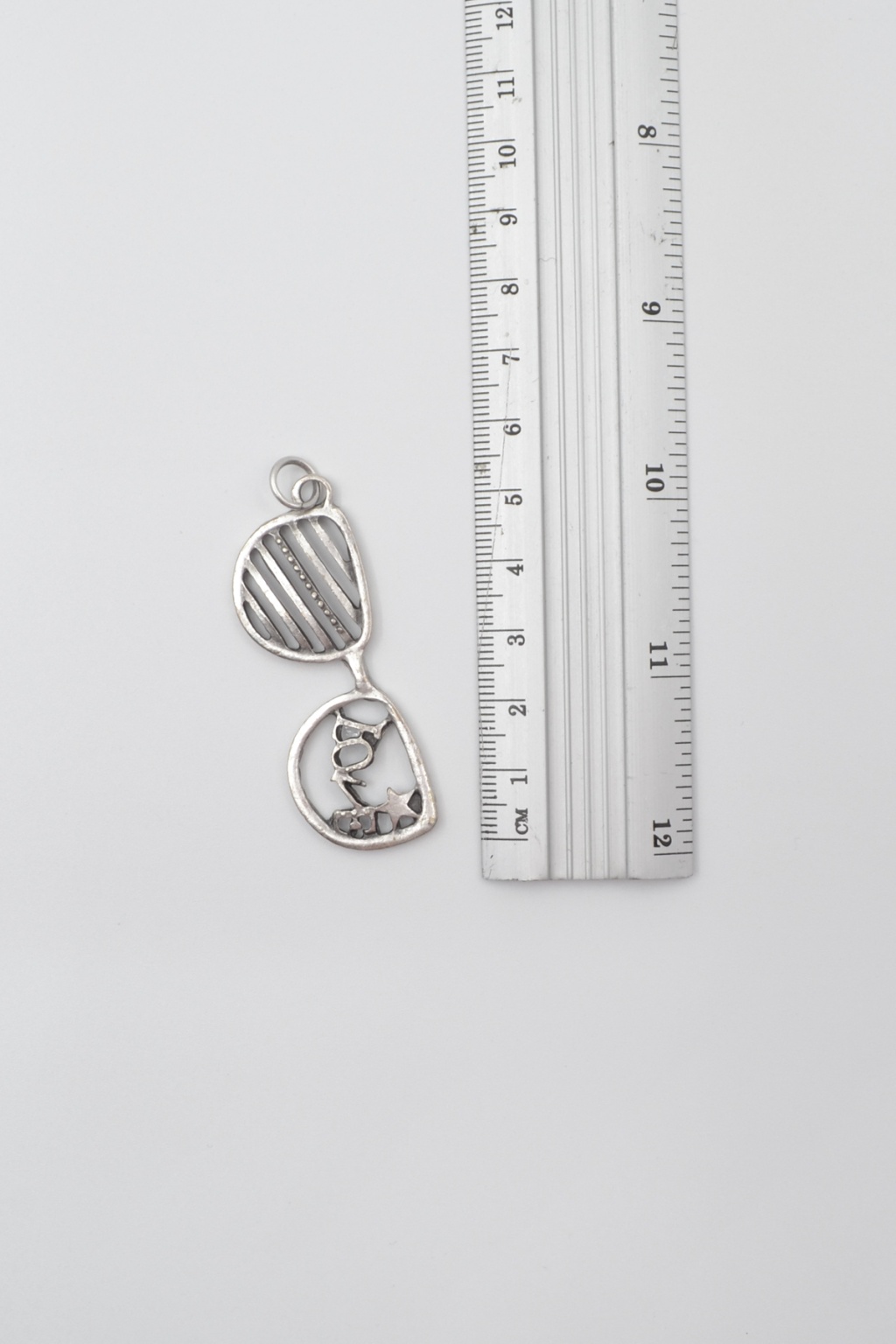 **Gözlük ve Love **, Kolye Ucu ürün grubuna ait, Antik Gümüş Kaplama malzemeden üretilmiştir. Bu özel parça, 5,6 cm yüksekliğe ve 2 cm genişliğe sahiptir. Antik Gümüş Kaplama kaplaması ile göz alıcı bir görünüm sunar ve Unisex için tasarlanmıştır.