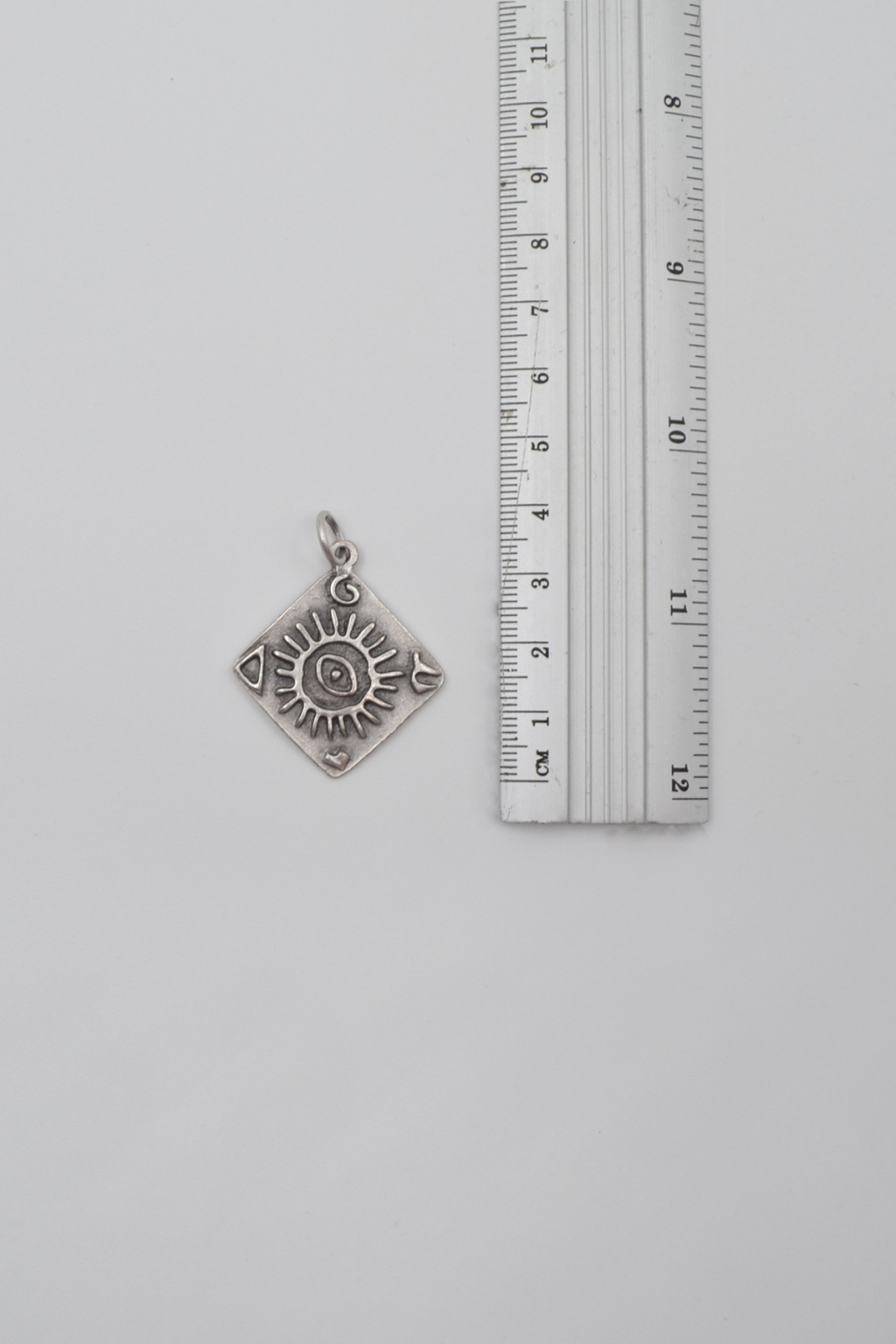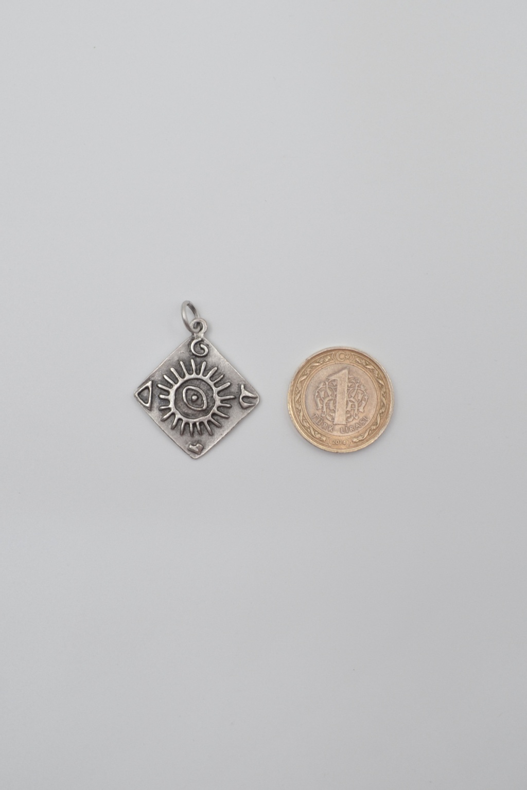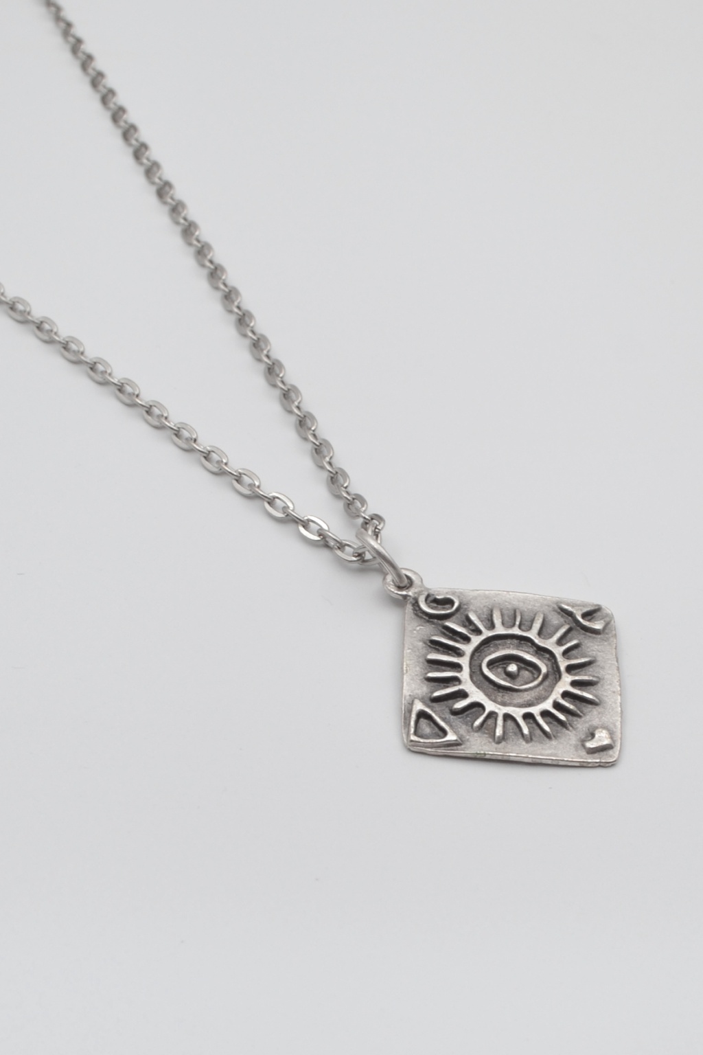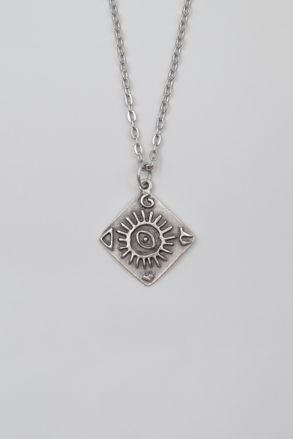 **Güneş ve Göz Sembollü **, Düz Ezme Zincir Kolye ürün grubuna ait, Antik Gümüş Kaplama malzemeden üretilmiştir. Bu özel parça, 3,4 cm yüksekliğe ve 3,1 cm genişliğe sahiptir. Antik Gümüş Kaplama kaplaması ile göz alıcı bir görünüm sunar ve Unisex için tasarlanmıştır. 60 cm uzunluğundaki zinciriyle tamamlanmıştır.