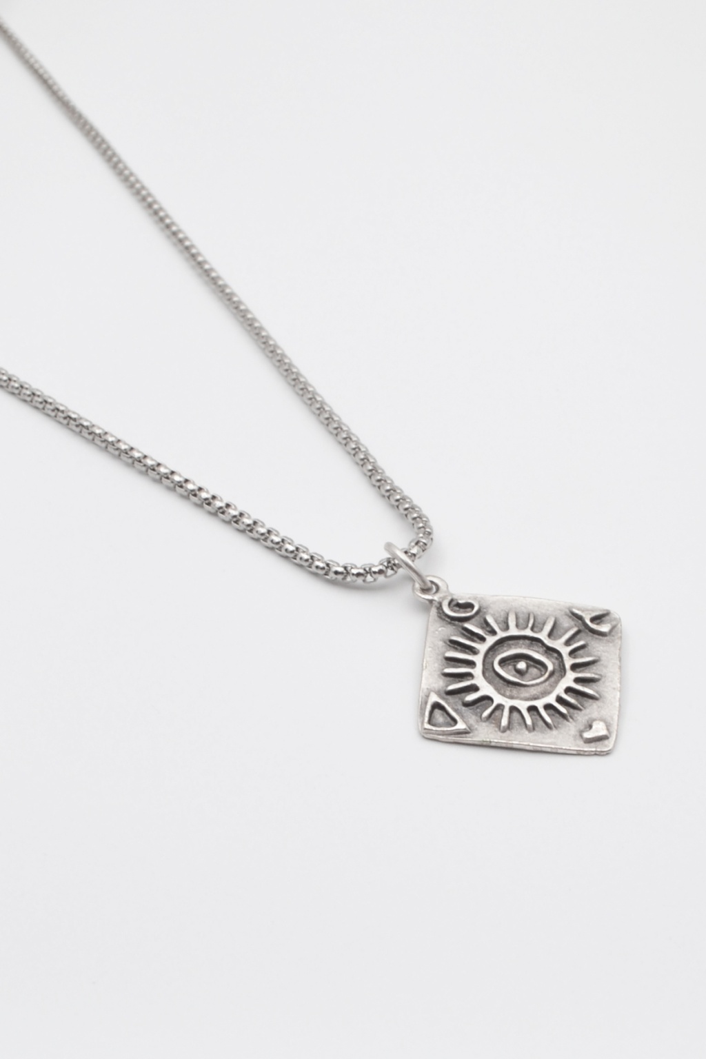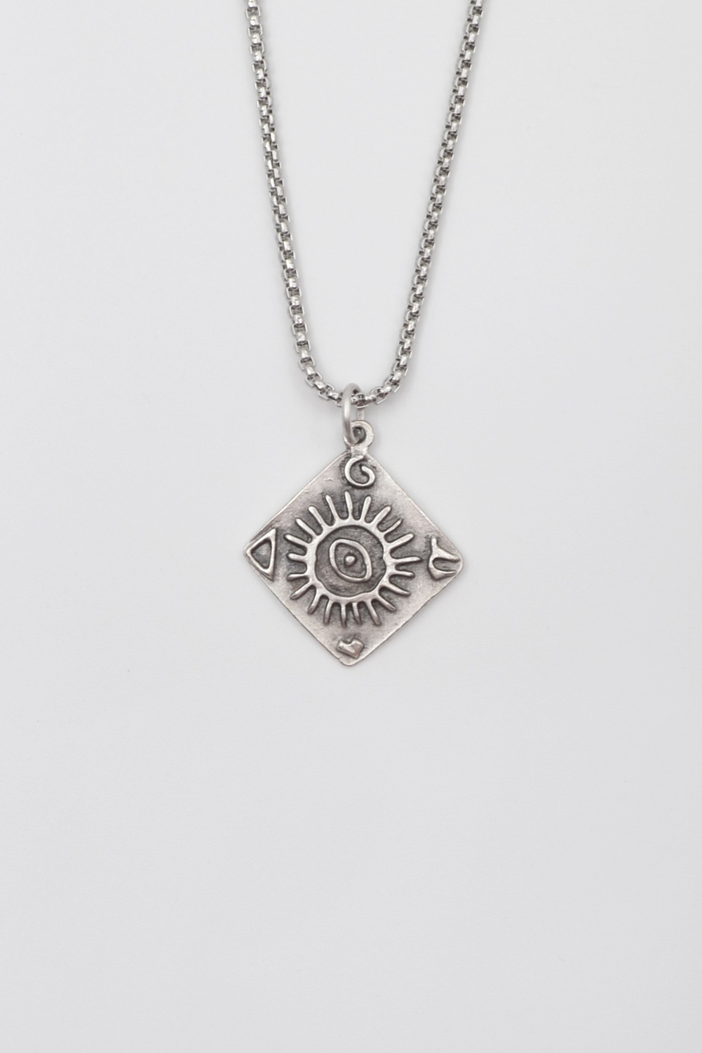 **Güneş ve Göz Sembollü **, Örme Zincir Kolye ürün grubuna ait, Antik Gümüş Kaplama malzemeden üretilmiştir. Bu özel parça, 3,4 cm yüksekliğe ve 3,1 cm genişliğe sahiptir. Antik Gümüş Kaplama kaplaması ile göz alıcı bir görünüm sunar ve Unisex için tasarlanmıştır. 60 cm uzunluğundaki zinciriyle tamamlanmıştır.