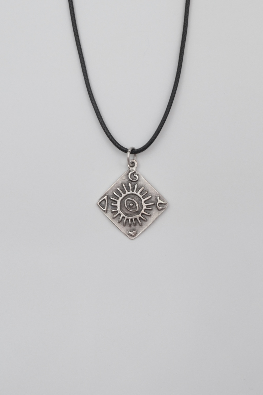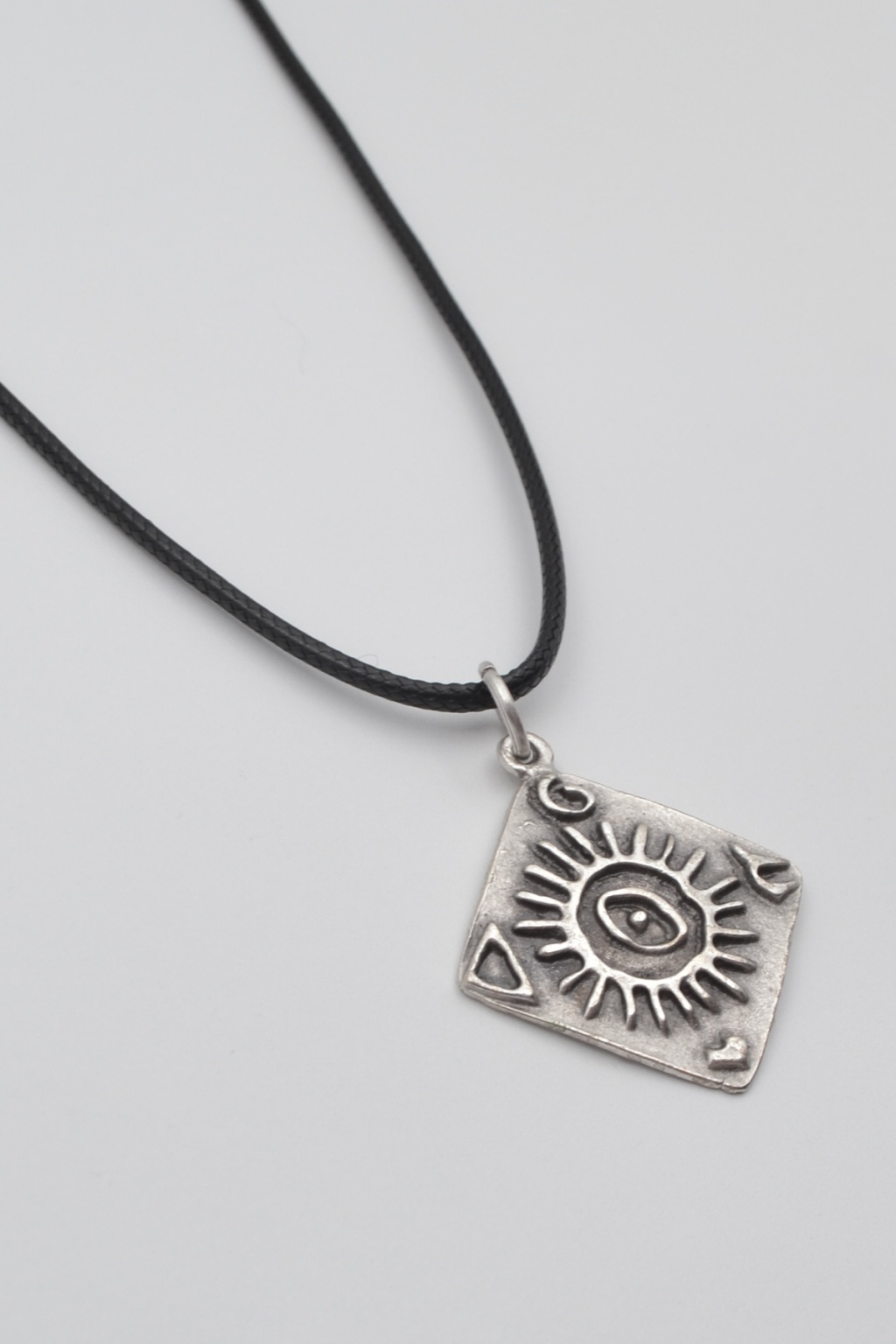 **Güneş ve Göz Sembollü **, Siyah Deri İp Kolye ürün grubuna ait, Antik Gümüş Kaplama malzemeden üretilmiştir. Bu özel parça, 3,4 cm yüksekliğe ve 3,1 cm genişliğe sahiptir. Antik Gümüş Kaplama kaplaması ile göz alıcı bir görünüm sunar ve Unisex için tasarlanmıştır. 60 cm uzunluğundaki zinciriyle tamamlanmıştır.