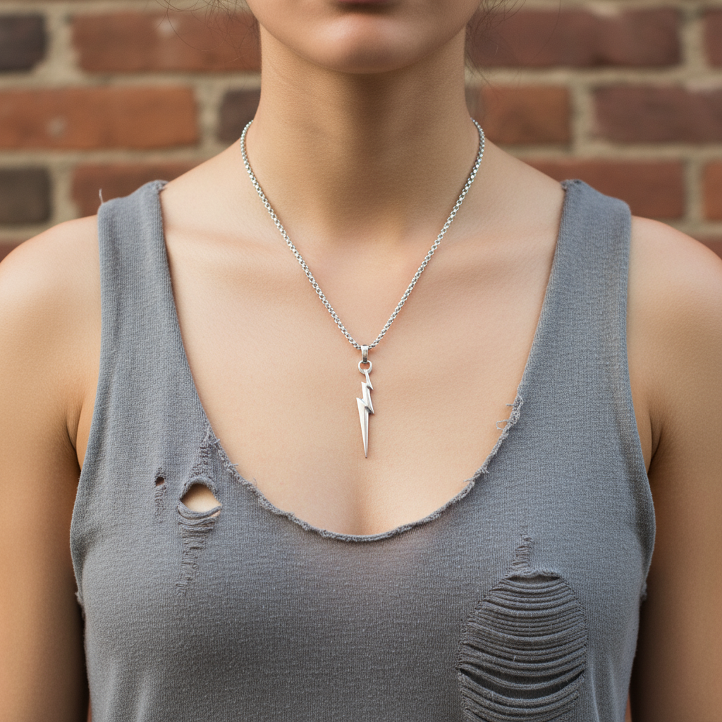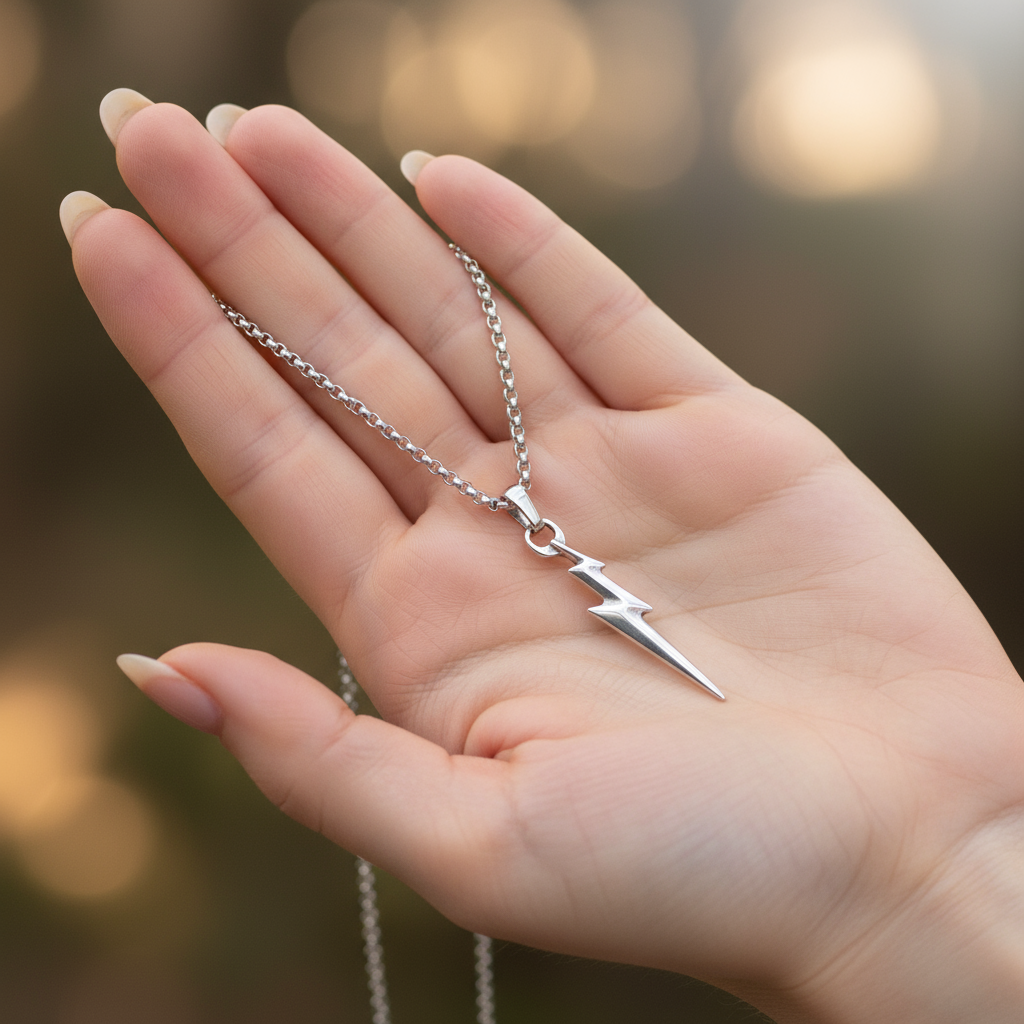 Alooya Şimşek – The Flash Kolyesi, cesur çizgileriyle dinamizmi, güç ve hız sembolünü temsil eder. Minimalist ama etkileyici bu tasarım, sade şıklığı sevenler için ideal bir parçadır. Antik gümüş kaplaması, zamansız bir stil sunarken aynı zamanda günlük kullanıma da uygundur.