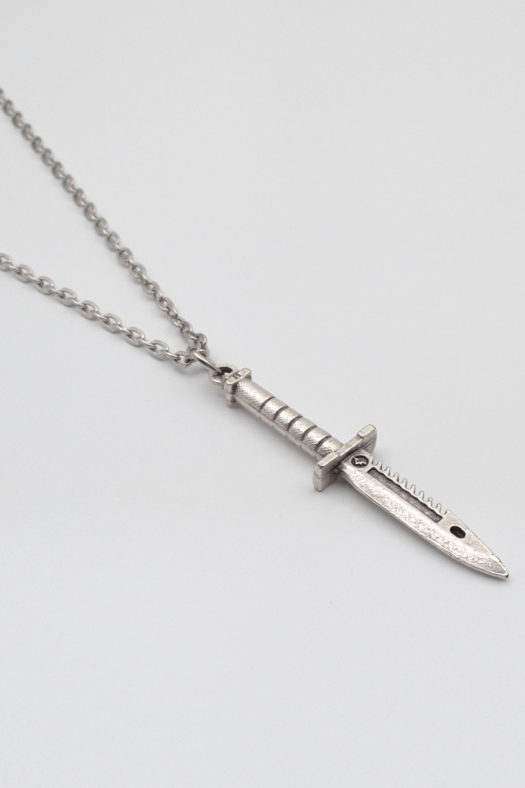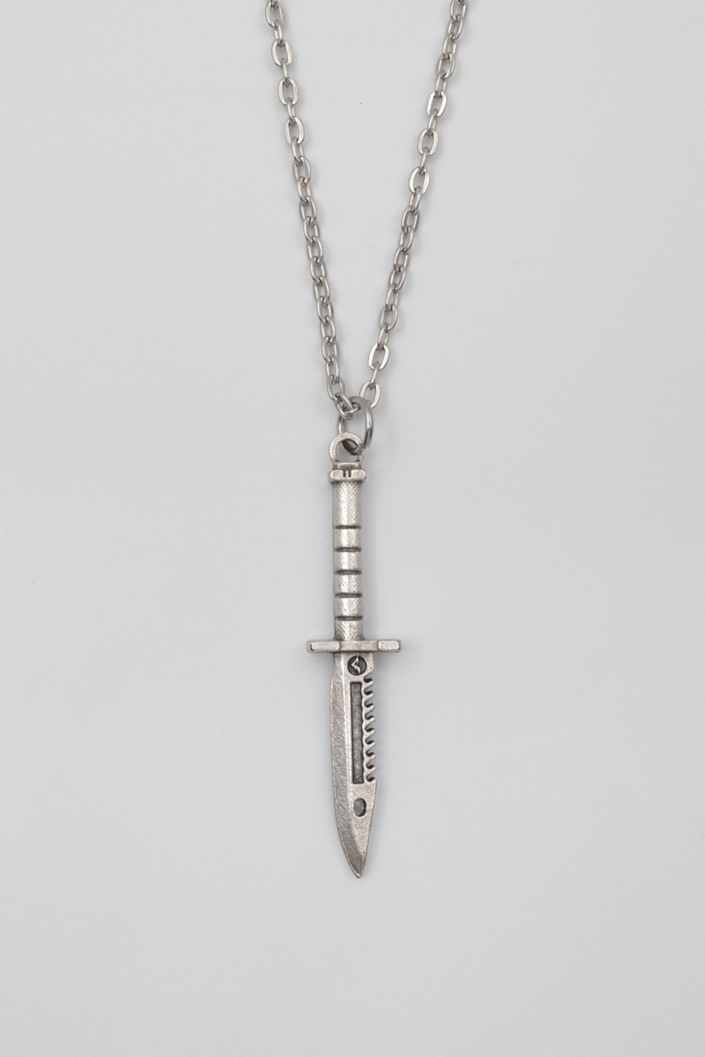 **Testere Dişli Taktik Bıçak **, Düz Ezme Zincir Kolye ürün grubuna ait, Antik Gümüş Kaplama malzemeden üretilmiştir. Bu özel parça, 5,9 cm yüksekliğe ve 1,2 cm genişliğe sahiptir. Antik Gümüş Kaplama kaplaması ile göz alıcı bir görünüm sunar ve Unisex için tasarlanmıştır. 60 cm uzunluğundaki zinciriyle tamamlanmıştır.