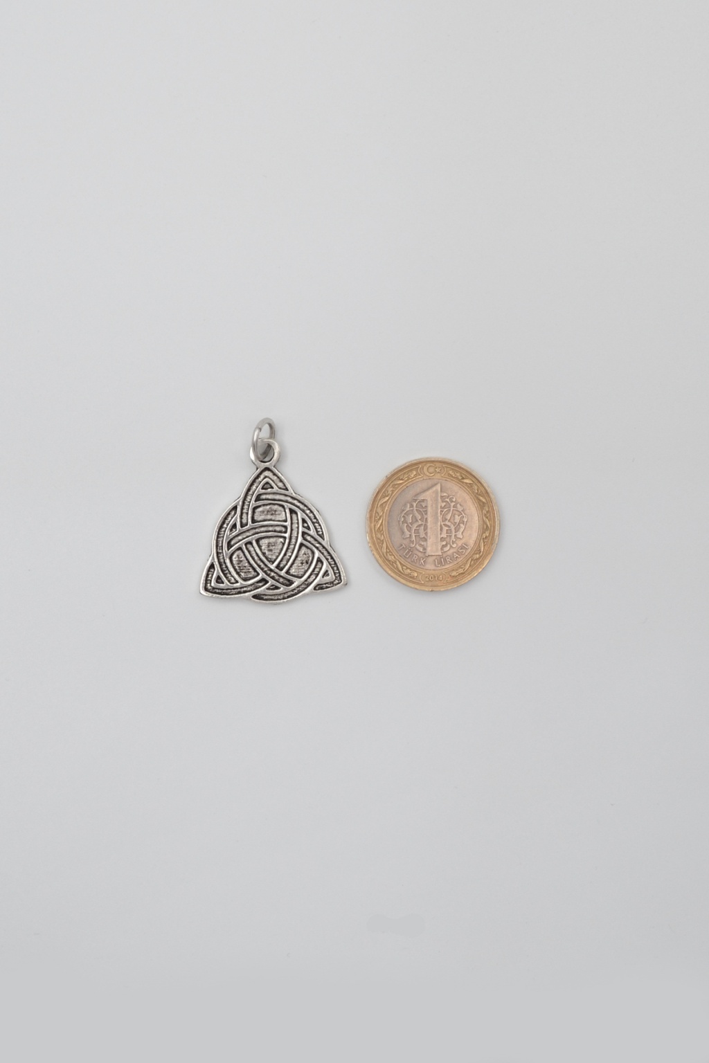 **Triquetra - Kelt Düğümü **, Kolye Ucu ürün grubuna ait, Gümüş Kaplama malzemeden üretilmiştir. Bu özel parça, 3,4 cm yüksekliğe ve 2,9 cm genişliğe sahiptir. Gümüş Kaplama kaplaması ile göz alıcı bir görünüm sunar ve Unisex için tasarlanmıştır.