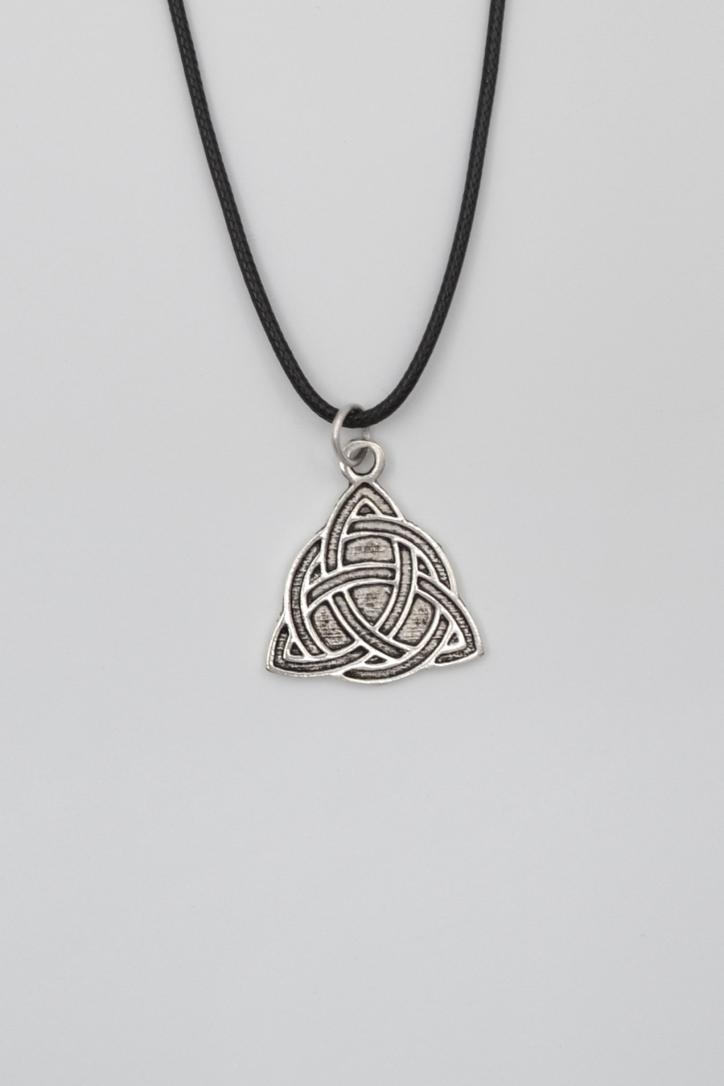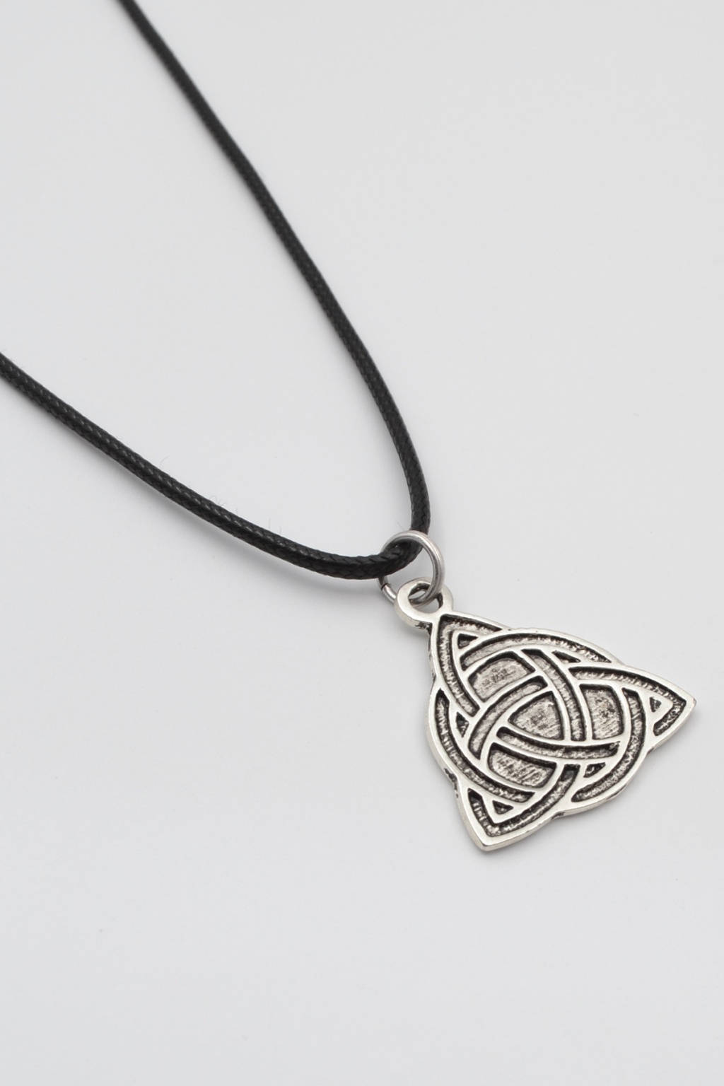**Triquetra - Kelt Düğümü **, Siyah Deri İp Kolye ürün grubuna ait, Gümüş Kaplama malzemeden üretilmiştir. Bu özel parça, 3,4 cm yüksekliğe ve 2,9 cm genişliğe sahiptir. Gümüş Kaplama kaplaması ile göz alıcı bir görünüm sunar ve Unisex için tasarlanmıştır. 60 cm uzunluğundaki zinciriyle tamamlanmıştır.