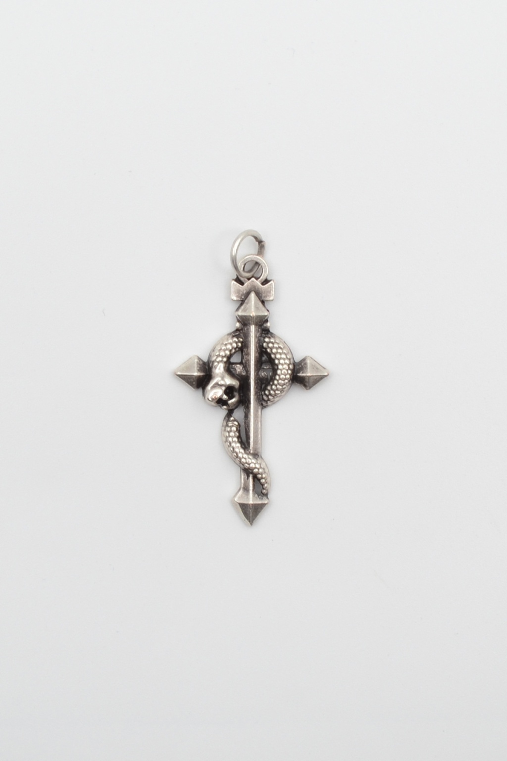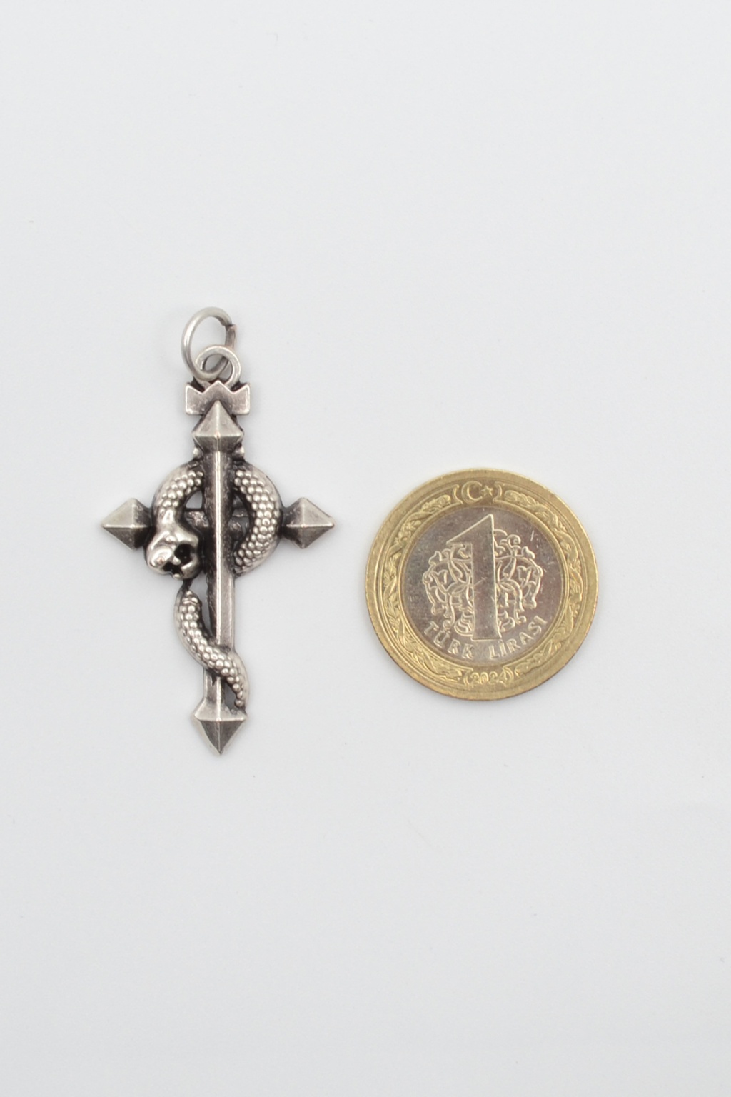 Zamak malzemeden üretilen bu Yılanlı Haç Figürlü Tasarımı, Antik Gümüş Kaplamasıyla şıklık ve dayanıklılık sunar.4,6 cm x 2,6 cm boyutları ve 3,90 gram ağırlığıyla koleksiyonlar için iadel bir parçadır.